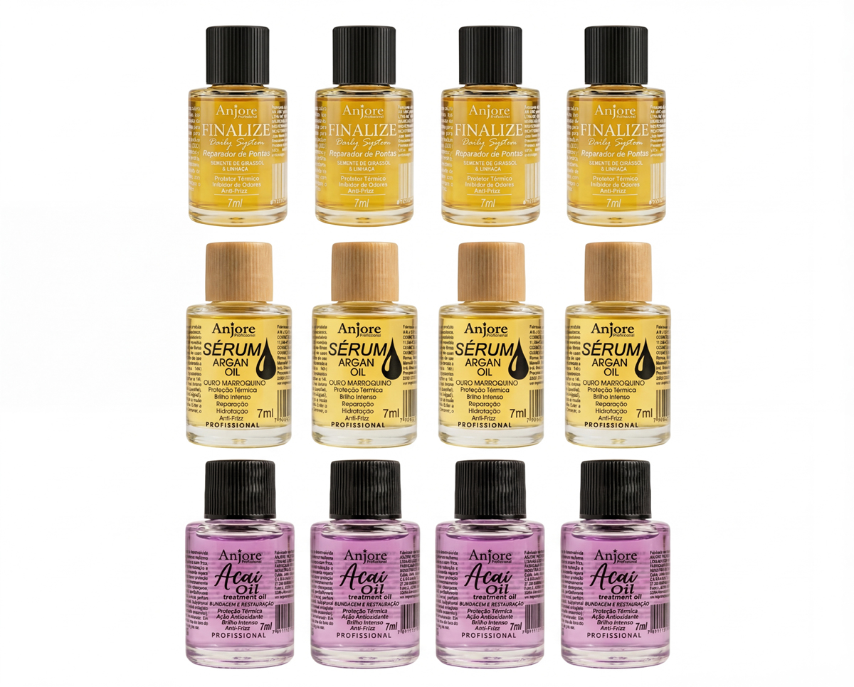 O Kit com 12 óleos capilares Anjore 7ml é perfeito para revenda, montagem de kits presenteáveis, brindes ou teste da linha profissional.