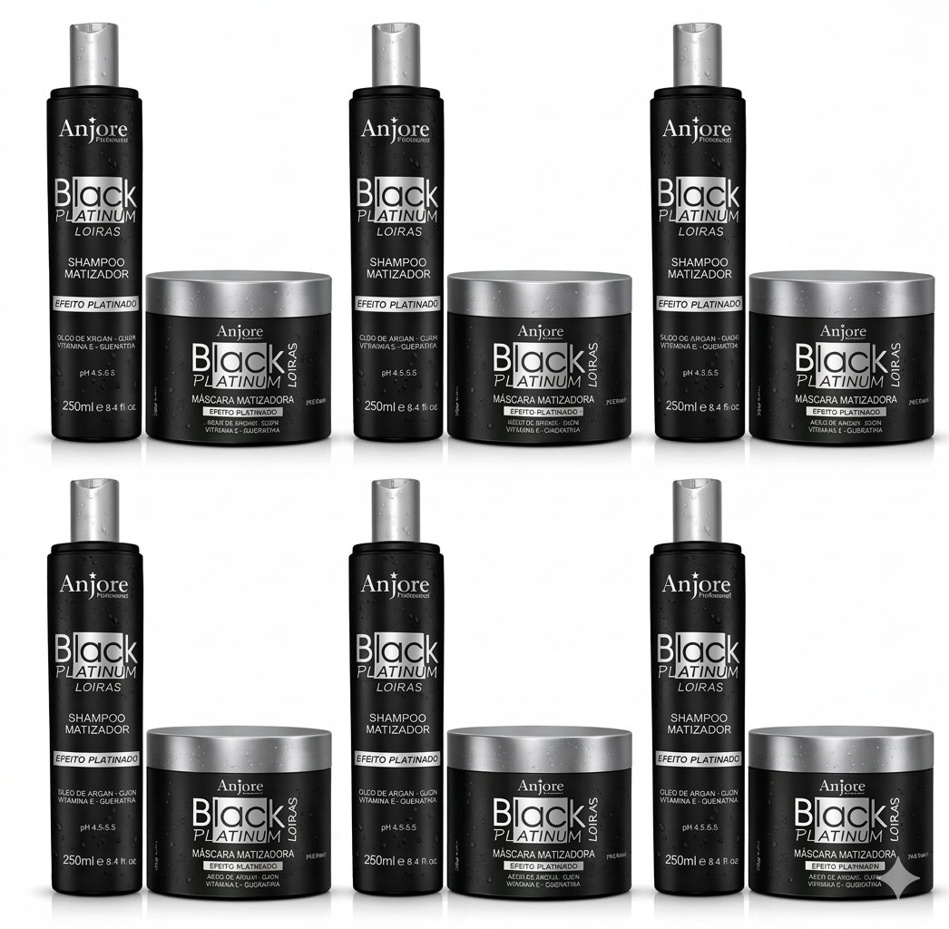 Você receberá: 6 - Shampoo Black Platinum Matizador 250ml Anjore 6 - Máscara Black Platinum Matizadora 250gr Anjore Kit Shampoo e Máscara Black Platinum Matizador e Platinador Loiros e Grisalhos com Óleo de Argan, Ojon, Queratina e Vitamina E 250ml Anjore Transforme seus cabelos loiros, grisalhos ou com mechas com um platinado perfeito e saudável! O Kit Black Platinum Matizador foi desenvolvido especialmente para cabelos loiros, grisalhos ou com mechas, proporcionando a neutralização dos tons amarelados ou alaranjados, e deixando os fios radiantes e com brilho intenso. Com a poderosa combinação de Óleo de Argan, Óleo de Ojon, Queratina e Vitamina E, o kit oferece não apenas uma matização perfeita, mas também uma hidratação profunda, reconstrução e proteção contra os danos diários. Esse kit é ideal para quem deseja manter o tom platinado impecável, sem ressecamento e com fios mais saudáveis, sedosos e com brilho duradouro. O que vem no Kit: Shampoo Black Platinum Matizador 250ml Limpeza e matização suave. O Shampoo Black Platinum Matizador realiza uma limpeza suave enquanto neutraliza os tons amarelados e alaranjados indesejados, deixando os fios com um tom platinado perfeito. Sua fórmula rica em Óleo de Argan, Óleo de Ojon e Vitamina E hidrata e protege os fios, mantendo-os saudáveis, fortes e com brilho radiante. Modo de uso: • Aplique o shampoo nos cabelos molhados, massageando o couro cabeludo e os fios até formar uma espuma cremosa. • Deixe agir por 2 a 3 minutos para garantir uma matização eficaz. • Enxágue bem e, se necessário, repita o processo. • Use luvas durante o manuseio do produto. Máscara Black Platinum Matizador 250ml Hidratação profunda e matização intensa. A Máscara Black Platinum Matizador proporciona uma matização intensiva, neutralizando os tons indesejados e deixando os fios platinados e iluminados. Sua fórmula rica em Óleo de Argan, Óleo de Ojon, Queratina e Vitamina E ajuda a restaurar a saúde dos fios, enquanto promove hidratação profunda e reconstrução da fibra capilar. Modo de uso: • Após o uso do shampoo, aplique a máscara nos fios úmidos, distribuindo de maneira uniforme de raiz às pontas. • Massageie suavemente para garantir uma absorção completa. • Deixe agir por 5 a 10 minutos, dependendo da intensidade de matização desejada. • Enxágue bem e aplique um condicionador de uso diário, de sua preferência, para um selamento ainda melhor do pigmento nos fios. • Enxágue bem e finalize como de costume. • Use luvas durante o manuseio do produto. Dica Profissional: Para um efeito matizador mais intenso, deixe a máscara agir por 10 minutos ou conforme a intensidade desejada. Use o Kit Black Platinum Matizador regularmente para manter seus fios sempre com o tom platinado perfeito, sem frizz e com brilho duradouro. Com o Kit Black Platinum Matizador, você terá cabelos loiros ou grisalhos deslumbrantes, hidratados e com a matização perfeita. Experimente e sinta a diferença de ter fios radiantes e saudáveis, dia após dia! Dica: Utilize luvas para evitar pigmentação nas mãos. Repita o tratamento 1 a 2 vezes por semana para manter a cor vibrante e o cabelo saudável. Respostas de Perguntas Frequentes: * Produto compatível com todas as químicas, exceto henê; * Não cobre cabelos brancos; * Não altera a cor do cabelo de uma para outra, por exemplo, do preto para o loiro; * Nenhum produto Anjore tem indicação para uso em crianças, gestantes e/ou lactantes. Maiores detalhes, consulte seu médico. * Produto de uso profissional, notificado na ANVISA.
