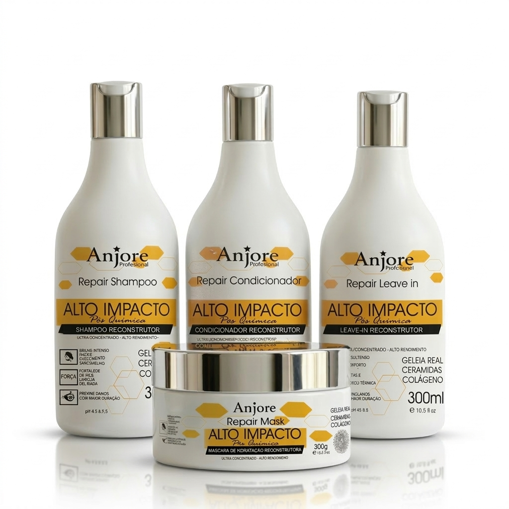 Kit Pós Progressiva e Química Alto Impacto Anjore Shampoo Condicionador Máscara Teia Leavein 300ml Colágeno e Geleia Real Transforme seus fios com o Kit Alto Impacto Anjore, uma combinação poderosa de Shampoo, Condicionador, Máscara e Leave-In, formulados com Colágeno, Geleia Real e Ceramidas. Esse tratamento completo oferece uma hidratação profunda, fortalecimento e proteção intensiva, deixando seus cabelos mais fortes, saudáveis, macios e com brilho radiante. Cada produto foi desenvolvido para atuar de forma única, mas complementar: • Shampoo Alto Impacto: Limpeza profunda e revitalização, preparando os fios para a ação dos próximos passos. • Condicionador Alto Impacto: Nutre e fortalece, proporcionando suavidade e selando a hidratação. • Máscara Alto Impacto: Um tratamento intensivo que hidrata e repara profundamente, restaurando a vitalidade dos fios. • Leave-In Alto Impacto: Proteção extra contra danos externos e frizz, com um toque aveludado e brilho instantâneo. Com ativos como Colágeno, que restaura a elasticidade, Geleia Real, que nutre e revitaliza, e Ceramidas, que formam uma barreira protetora, esse kit oferece fios mais fortes, brilhantes e controlados, sem pesar. Experimente o poder desse tratamento completo e sinta seus cabelos renovados, livres de frizz e com movimento natural. A cada lavagem, seus fios se tornam mais saudáveis e deslumbrantes! O Kit Alto Impacto Anjore é a solução definitiva para quem busca cabelos profundamente cuidados, restaurados e radiantes, com a força dos melhores ativos para um tratamento completo. Modo de Uso: 1. Shampoo Alto Impacto: Aplique nos cabelos úmidos e massageie suavemente o couro cabeludo até formar espuma. Enxágue bem e repita a aplicação, se necessário, para uma limpeza profunda. 2. Máscara Alto Impacto: Após o shampoo, aplique a máscara nos cabelos úmidos, mecha por mecha. Deixe agir de 5 a 10 minutos e enxágue bem. Para um efeito mais intenso, use 1-2 vezes por semana. 3. Condicionador Alto Impacto: Após a máscara, aplique o condicionador nos cabelos úmidos, distribuindo da raiz às pontas. Massageie suavemente e deixe agir por 1-3 minutos. Enxágue completamente. 4. Leave-In Alto Impacto: Após a lavagem e aplicação do condicionador, aplique o leave-in nos fios úmidos, distribuindo de maneira uniforme. Não enxágue e finalize como desejar, com secador, chapinha ou ao natural.