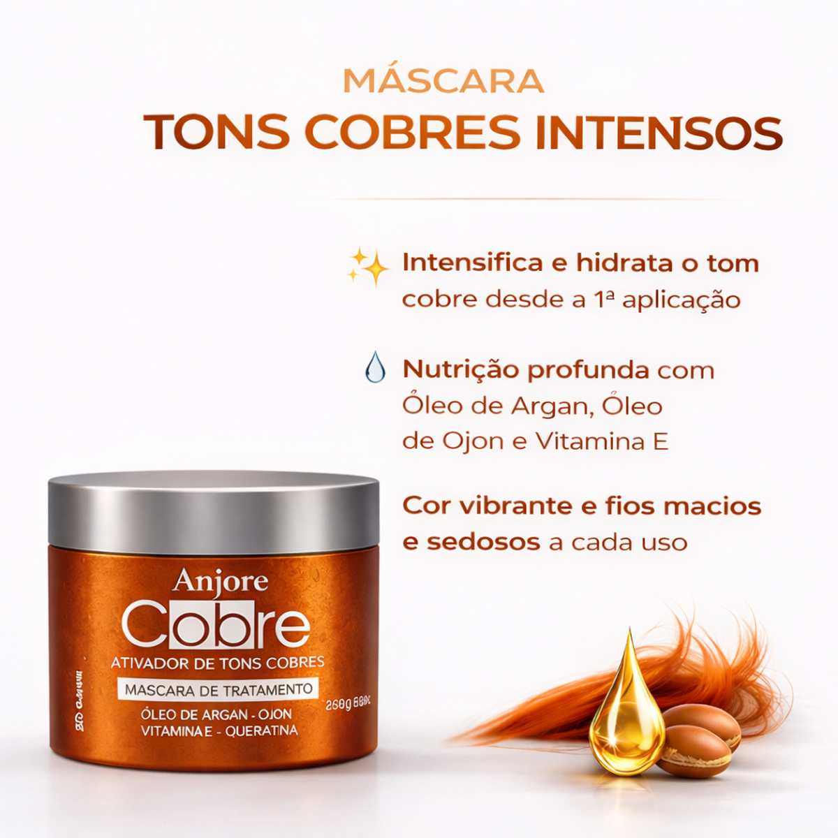 A Máscara Matizadora Cobre Anjore foi desenvolvida especialmente para cabelos cobres e ruivos que precisam de mais intensidade na cor, brilho espelhado e reparação profunda da fibra capilar. ✨